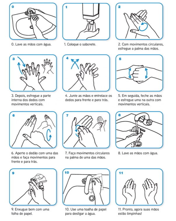 A imagem abaixo demonstra o passo a passo da higienização das mãos com água e sabão: