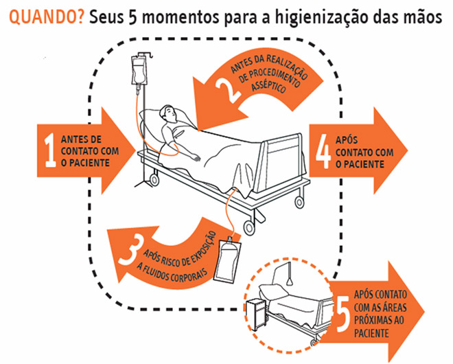 A Organização Mundial da Saúde (OMS) preconiza a realização de cinco momentos para a realização da higienização das mãos, sendo elas: